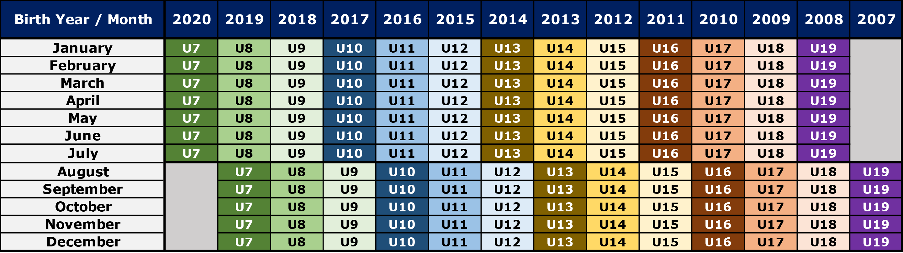 Simply put, in the 2025 season teams were formed by “Calendar Year”, so the players born in a calendar year (January 1st to December 31st) were in an age group. The 2026 season will introduce the new “Seasonal Year” age groupings. Seasonal Year age groups use August 1st to July 31st birthdays, like they do for your kids school. So the oldest kids in an age group will now be born August 1st, and not January 1st. The below chart helps to visualize how the “Seasonal Year” age groups work for the upcoming Spring 2026 season.